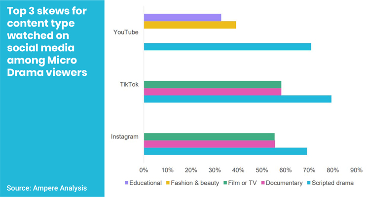 This surge in production caters to an audience that already views social media platforms as TV-style entertainment hubs. For Micro Drama viewers, the strongest consumption skew on social media is for scripted drama, although they also heavily consume documentaries and vlogs.