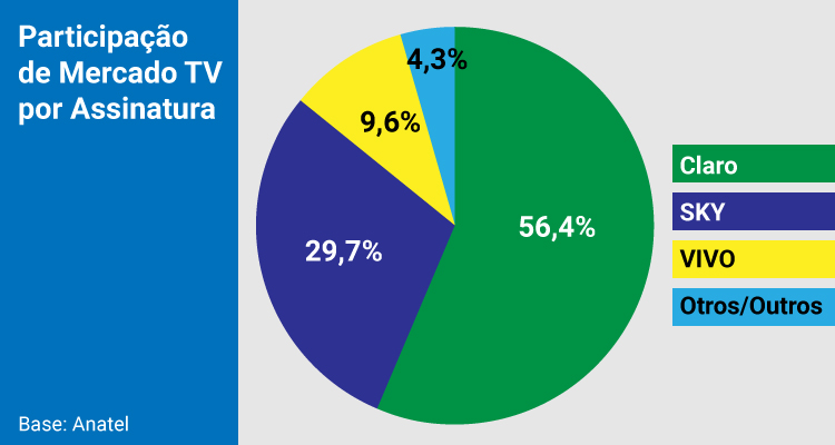 El servicio de TV paga sigue en retracción: de 9,54 millones en mayo de 2024, se redujo a 6,86 millones de suscriptores en mayo de 2025, según datos oficiales de Anatel. Claro lidera el mercado con un 56,4% de participación, seguida por SKY (29,7%) y Vivo (9,6%). En cuanto a tecnologías, el satélite representa el 46,1% de los accesos, el cable el 40,7% y la fibra óptica el 13,1%. Aun en descenso, el servicio sigue presente en muchos hogares brasileños.