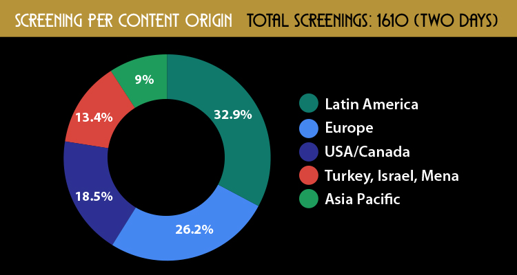 About screenings per content origin, we confirm once more that Latin America leads the market these two days, with two distributors of the top 3 at the ranking included in main article of the daily. But Europe is close and approaching. The very good performance of Spain, with various series in the top 15 contents, has many to do, but also Germany or France, for instance. Turkey and Asia will grow from now.